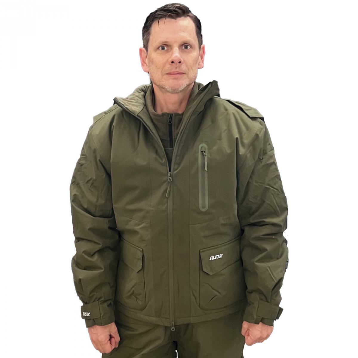 A SILSTAR Exclusive Line Thermo, thermo kabát. A ruha felülete kényelmes, puha tapintású teljesen vízhatlan, víztaszító anyagból készült, amely NEM SURROG, NEM AD KI HANGOT mozgás közben, így nagyon alacsony a zajszintje, un. whisper(suttogó) karakterisztikájú, éppen ezért ideális választás VADÁSZATHOZ is. A puha belső borítás alatt vastag, meleg, bevarrt PVC bélés található, így az nem csúszik el. A ruházat alapanyaga 100% magas kopásállóságú twill peach mikroszálas poliészter, mely különlegesen magas vízállóságú, 8000/800 mvp DE mindezek mellett PVC bevonattal is el van látva és MINDEN VARRATA RAGASZTOTT IS, ami által - A RUHA TELJESEN VÍZ-ESŐ-SZÉLÁLLÓ! A kabát külső részén 3 db vízmentesen zárható zseb található, belsejében 1 db nagy zárható és 1db óriási méretű hálós zseb fokozzák a kényelmi és prakikus funkciókat. A kabát gallérja magas, jól véd a szél ellen. A kapucninak szintén van gallérja, mely tépőzáras így dupla védelmet biztosít. A kabát tépőzárral állítható mandzsettája is puha, meleg, bélelt. A kapucni levehető, jól védi a nyakat a széltől-esőtől, a fejet, de összezárt tépőzárral az állat sőt még szánkat is megvédi a hideg széltől. A kabát derékrészét rugalmas belső szalag tartja a testünk mellett, így nem fúj alá a szél. Az összes cipzár szél- és vízálló.